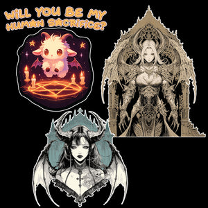 This exclusive collection features three uniquely captivating designs: the Eternal Valkyrie Sticker, the Goth Baddie With Wings Sticker, and the Will You Be My Human Sacrifice? Sticker.